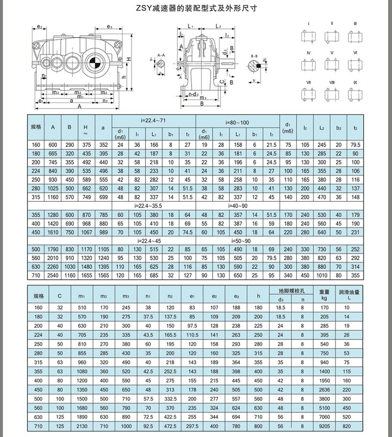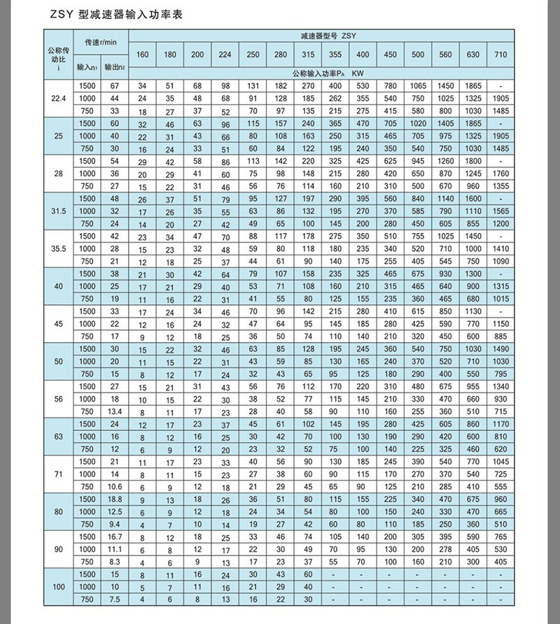 ZSY圓柱齒輪減速機是三級齒輪減速機,它是平行軸減速器,此類減速機中心距,公稱傳動比等主要參數(shù)均經(jīng)優(yōu)化設計,主要零、部件互換性好,齒輪均采用優(yōu)質(zhì)合金鋼經(jīng)滲碳、淬火而成,齒面硬度達54-62HRC,該產(chǎn)品體積小,重量輕,精度高,噪音低,一般采用油池潤滑,自然冷卻,工作環(huán)境溫度為-40+50度,如果低于0度,啟動前潤滑油應預熱至0度以上,本減速器可用于正反兩個方向運轉。ZSY圓柱齒輪減速機有22.4,25,28,31.5,35.5,40,45,50,56,63,71,80,90,100十四種傳動比,九種安裝方式   SY減速機產(chǎn)品是按標準JB/T8853-2001生產(chǎn)的外嚙合漸開線斜齒圓柱齒輪減速機。